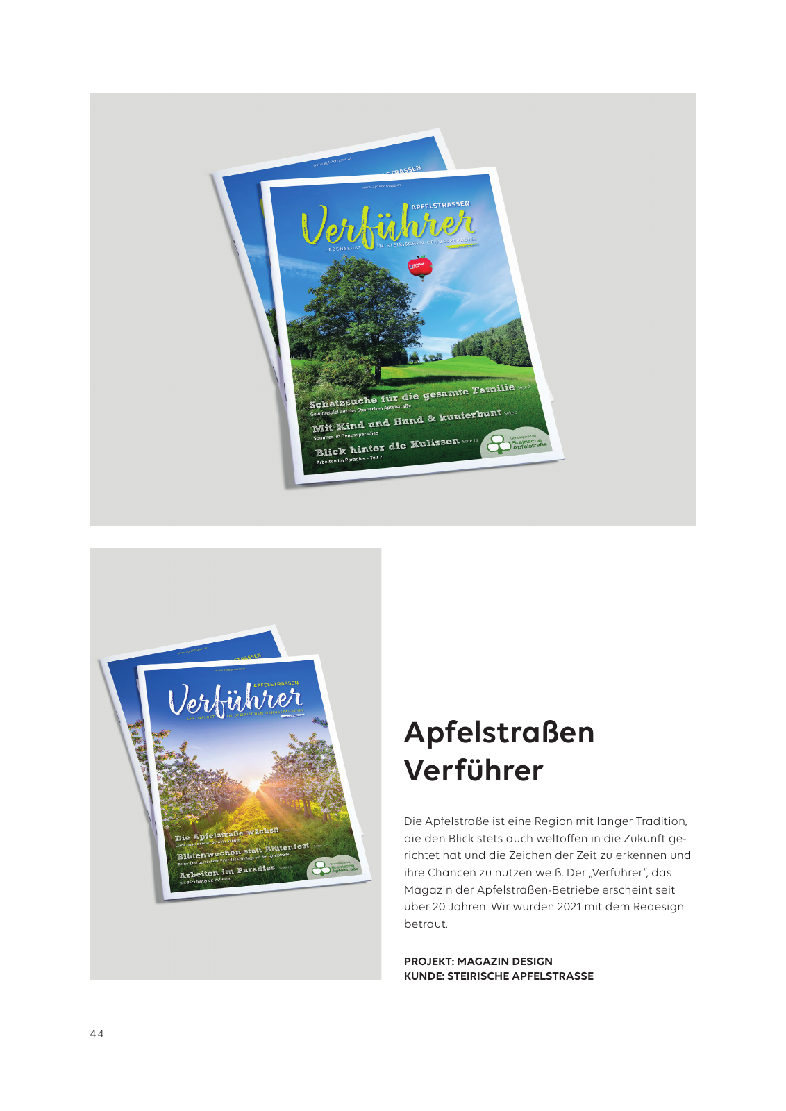 44 Apfelstraßen Verführer Die Apfelstraße ist eine Region mit langer Tradition die den Blick stets auch weltoffen in die Zukunft ge richtet hat und die Zeichen der Zeit zu erkennen und ihre Chancen zu nutzen weiß Der Verführer das Magazin der Apfelstraßen Betriebe erscheint seit über 20 Jahren Wir wurden 2021 mit dem Redesign betraut PROJEKT MAGAZIN KUNDE STEIRISCHE APFELSTRASSE